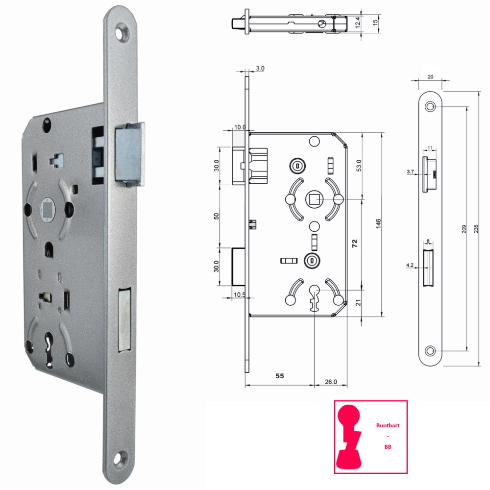 Produktinformationen "Bever Einsteckschloss Zimmertür BB PZ WC 55/72/8 - 20mm Stulp rund Metallfalle"