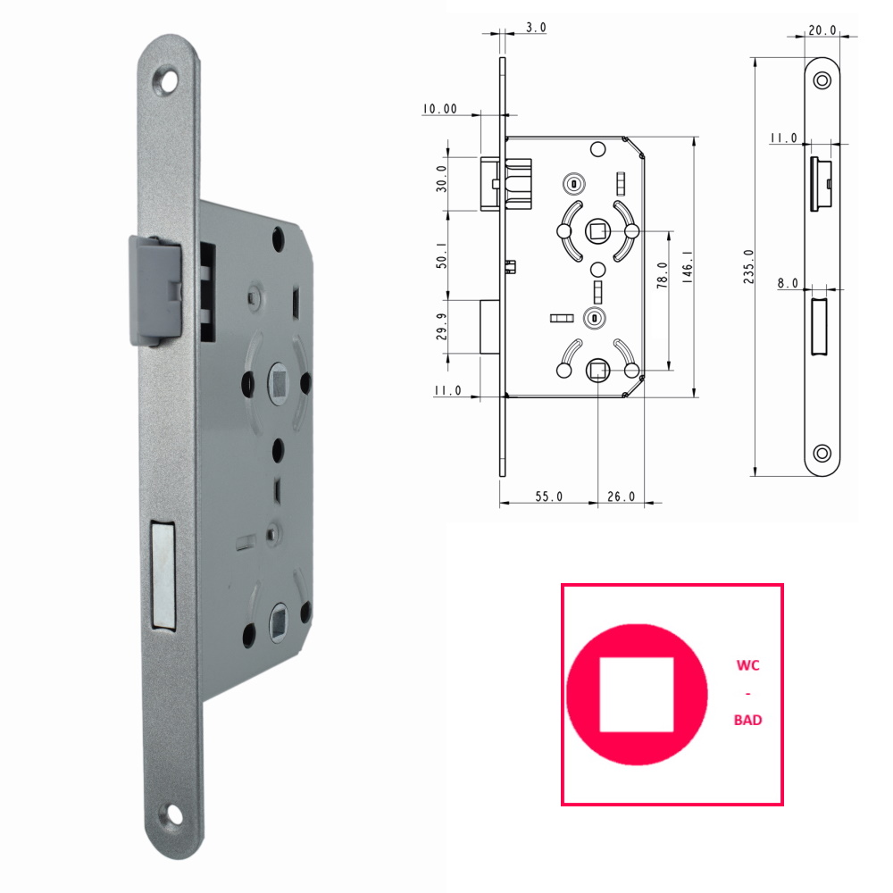 Produktinformationen "Bever Einsteckschloss Zimmertür BB WC 55/72/8 - 20mm Stulp rund Kunststofffalle"