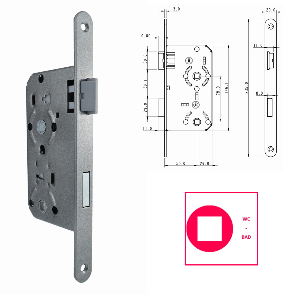 Produktinformationen "Bever Einsteckschloss Zimmertür BB WC 55/72/8 - 20mm Stulp rund Kunststofffalle"