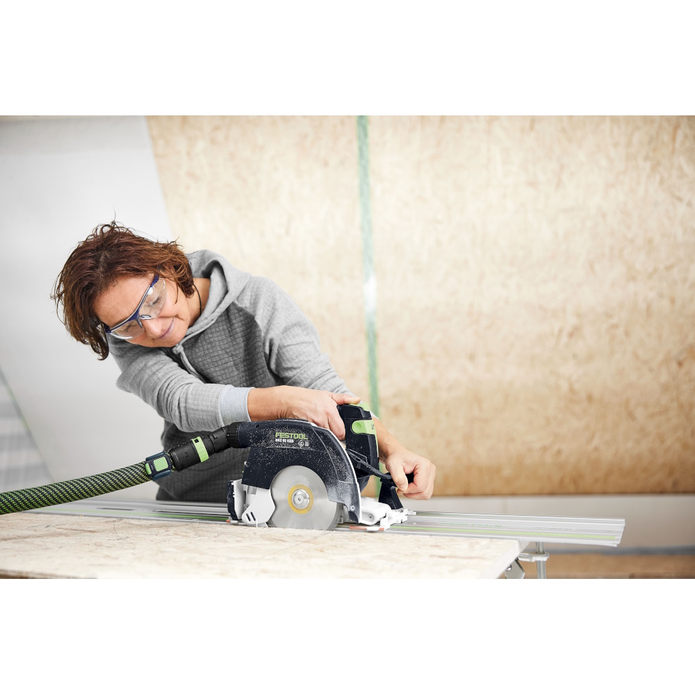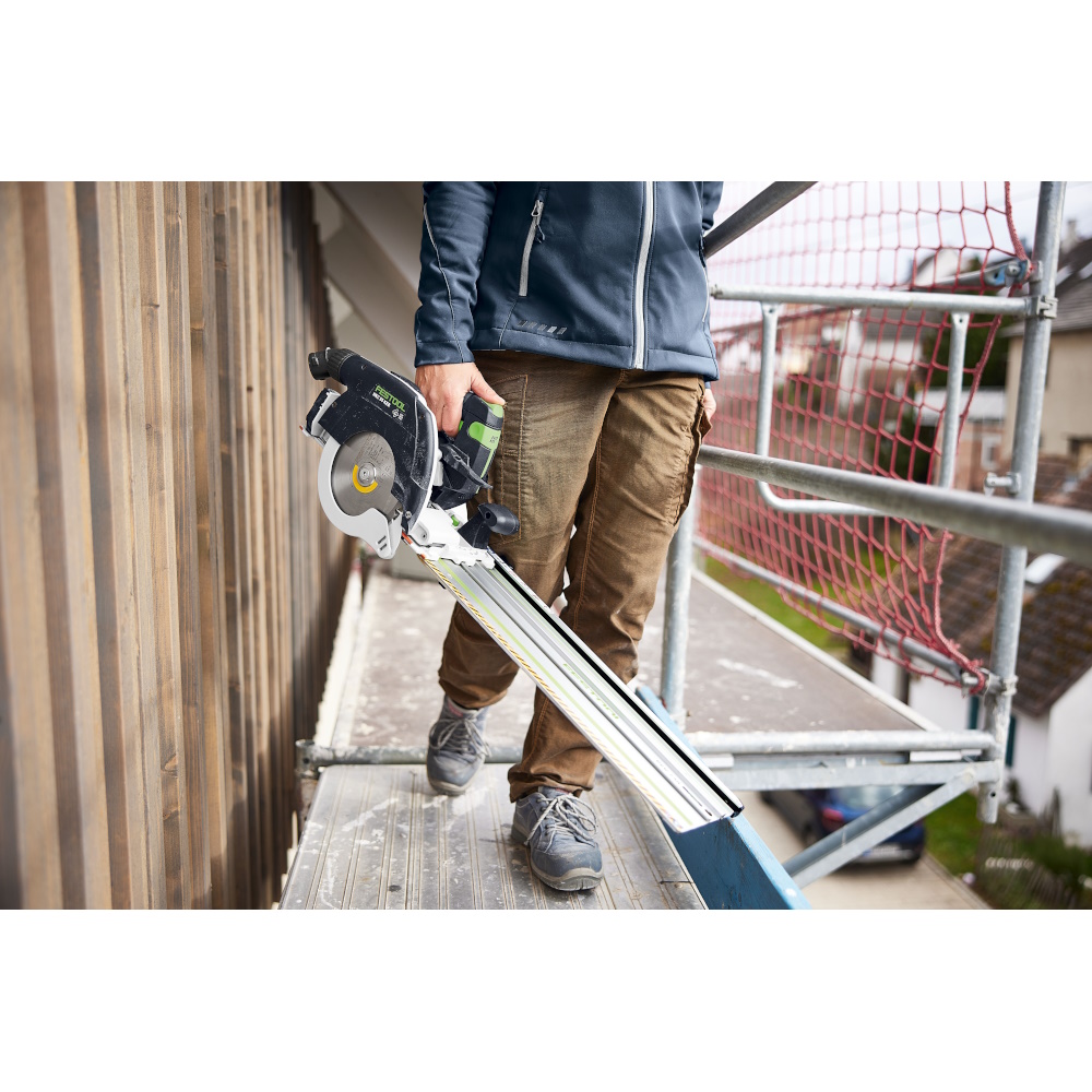 Die Festool HKC 55 KEB-Basic Akku-Handkreissäge steht für maximale Leistung, höchste Präzision und volle Mobilität auf der Baustelle. Ob Kappschnitte mit der Kappschiene FSK, exakte Längsschnitte mit Führungsschiene FS oder winkelgenaue Gehrungsschnitte – diese 18V Akku-Handkreissäge ist für den professionellen Einsatz konzipiert. Dank KickbackStop, EC-TEC Motor und durchdachter Sicherheitsfunktionen arbeitest du jederzeit kraftvoll, sicher und effizient.