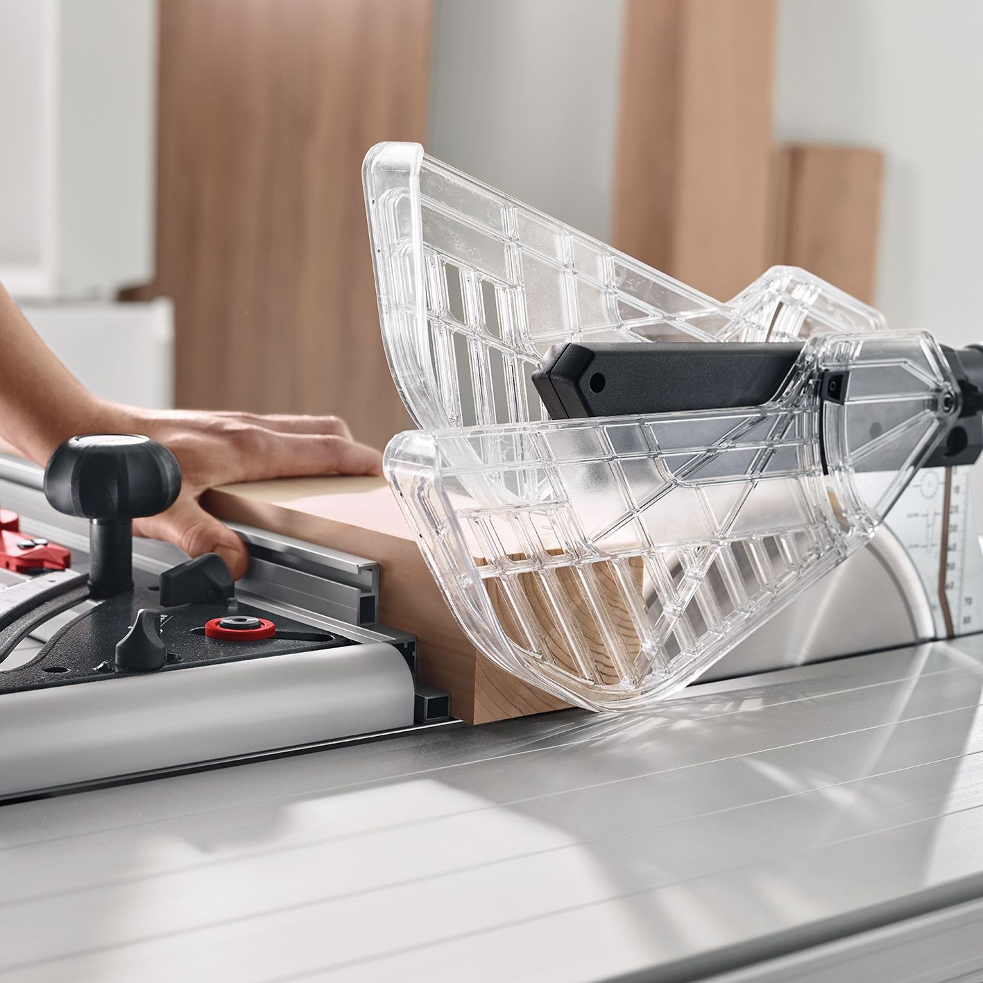 Sicherheitsfunktionen: Die teilweise transparente Schutzhaube und das sensorgesteuerte Arbeitslicht garantieren sowohl Sicherheit als auch eine exzellente Sicht auf den Schnitt.