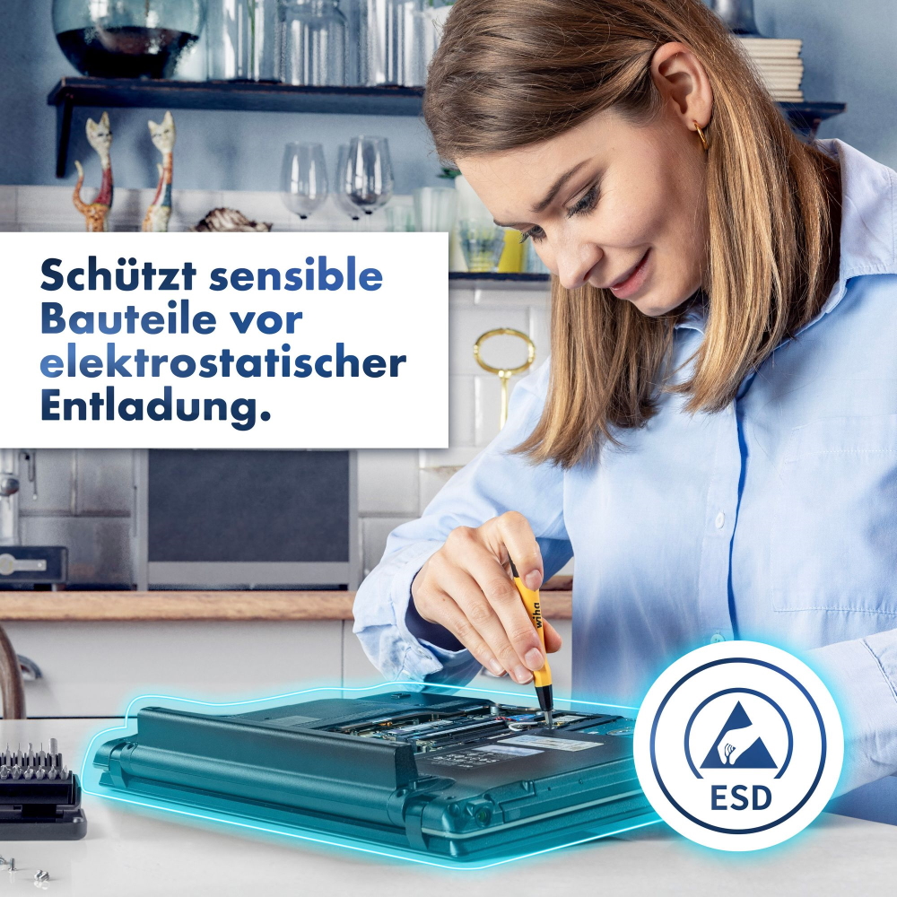 Der hochwertige elektrostatisch ableitende Wiha ESD Griff schützt vor Entladung und bietet höchste Sicherheit für Ihre Elektrogeräte.