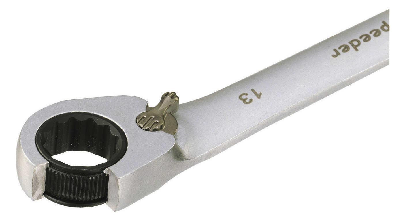 Ein Umlegen des um 15° abgewinkelten Kopfes (ringseitig) ist nicht möglich. Deshalb hat dieser Schlüsseltyp eine Hebelumschaltung für Rechts- und Linkslauf. Ideal zum Schrauben an Planflächen.