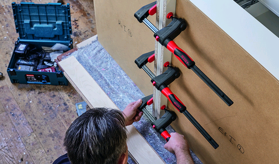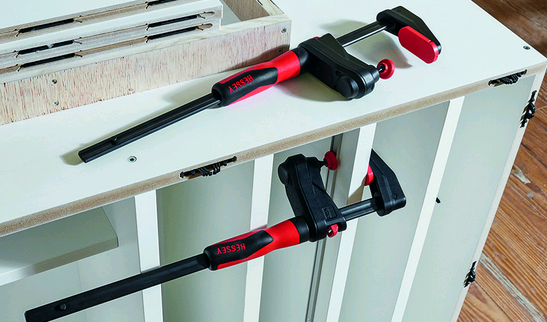 - Um die Schiene positionierter hochwertiger 2-Komponenten-Kunststoffgriff zum Einsatz der Zwinge auf engstem Raum