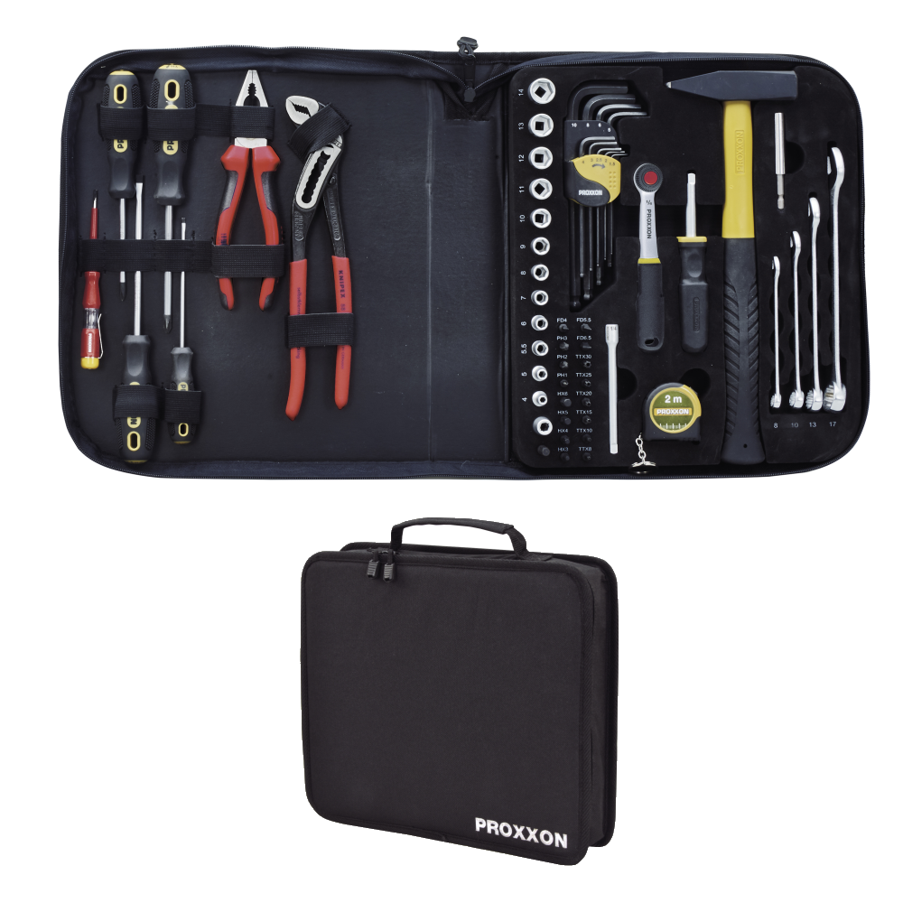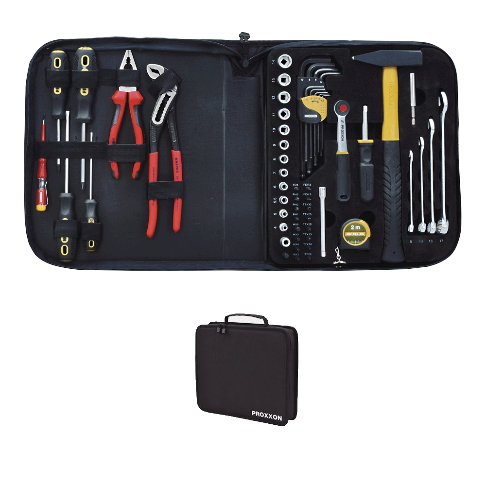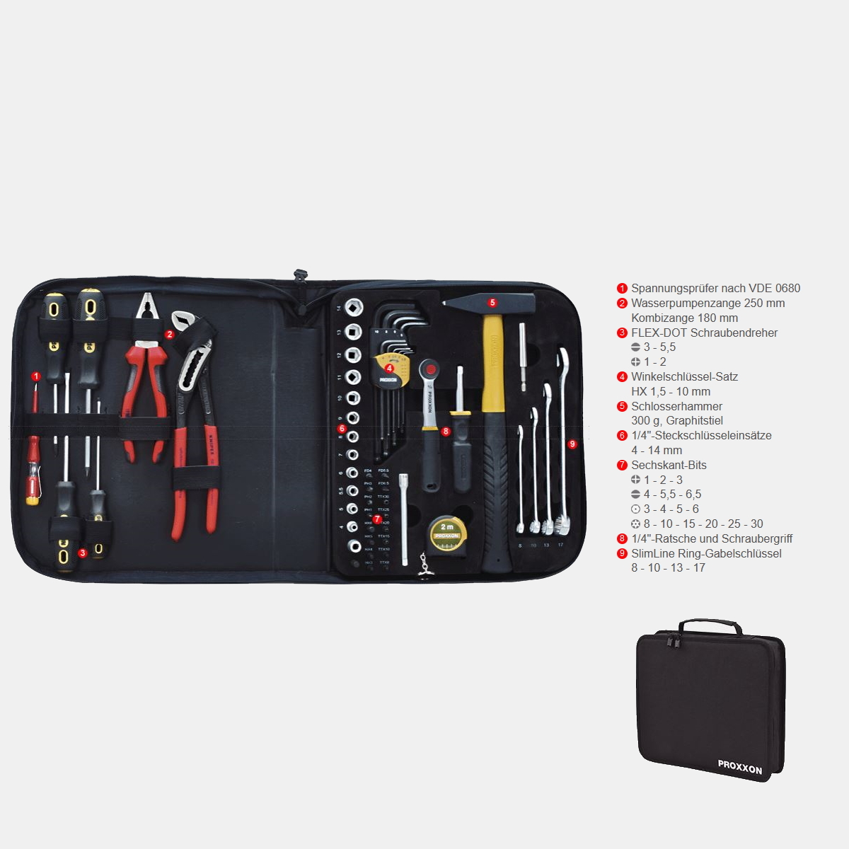 Zusätzlich zu diesen Werkzeugen enthält die Tasche noch weitere nützliche Utensilien, die auf der Abbildung zu sehen sind. Die Proxxon Universal Werkzeugtasche ist somit nicht nur ein praktischer Begleiter für Handwerker, sondern auch ein gut organisiertes System zur Aufbewahrung und zum Transport Ihrer Werkzeuge.