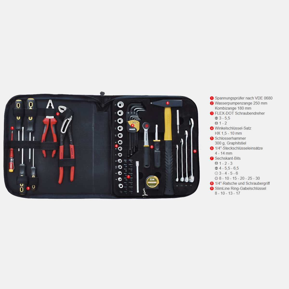 Für präzise Arbeiten stehen 16 Sechskantbits aus hochlegiertem Spezialstahl zur Verfügung, die sich durch ihre hohe Qualität und Langlebigkeit auszeichnen. Der SlimLine-Ring-Gabelschlüssel-Satz umfasst Schlüsselgrößen von 8 bis 17 mm, während der Winkelschlüsselsatz in den Größen HX 1,5 bis 10 mm bereitliegt – ideal für verschiedene Anwendungen.