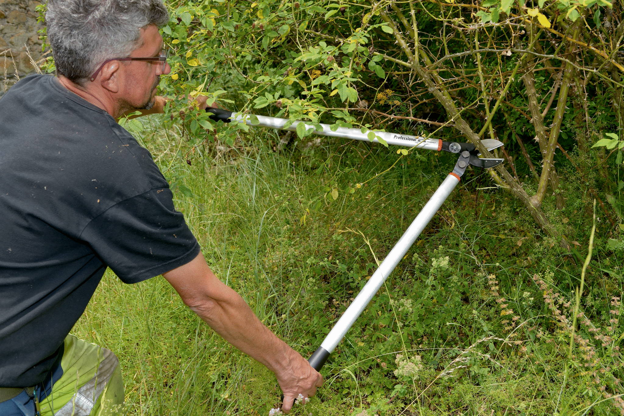 - Leichte, robuste und lange Aluminium-Griffe für große Reichweite und Über-Kopf-Schnitte
