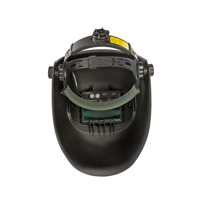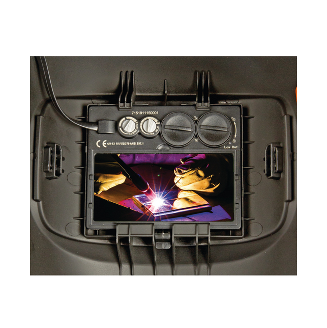 - Umschalten zwischen Schleif- und Schweißmodus und stufenlose Einstellung der dunklen Schutzstufe außen am Helm