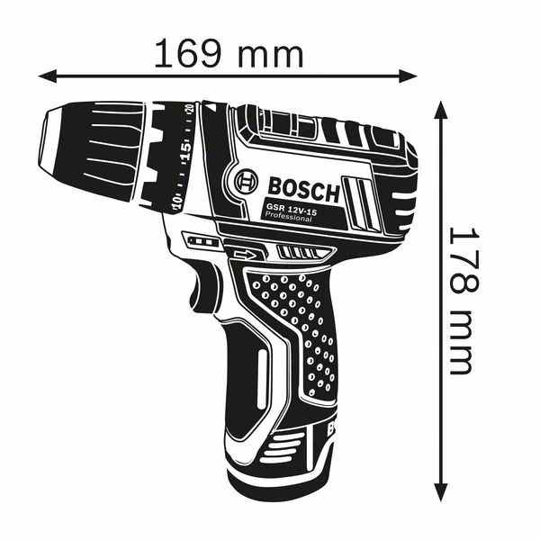 Der Akku-Bohrschrauber GSR 12V-15 Professional bietet in der 12-Volt-Klasse von Bosch ein ausgewogenes Verhältnis zwischen Leistung und Größe. Sein hartes Drehmoment von 30 Nm und 0-1.300 U/min sorgen für das beste Verhältnis zwischen Größe und Leistung. Sein kompaktes Design ermöglicht optimales Handling und ist ideal zum Arbeiten über Kopf und an engen Stellen. Überlastung, Überhitzung und Tiefentladung werden durch die Electronic Cell Protection des Bohrschraubers verhindert. Dieses Elektrowerkzeug wurde zum Bohren in Holz mit einem maximalen Durchmesser von 19 mm, in Stahl bis 10 mm und für Schraubdurchmesser bis 7 mm konzipiert. Das Gerät ist mit allen Bosch Professional 12-Volt-Akkus und -Ladegeräten kompatibel (Professional 12V System).