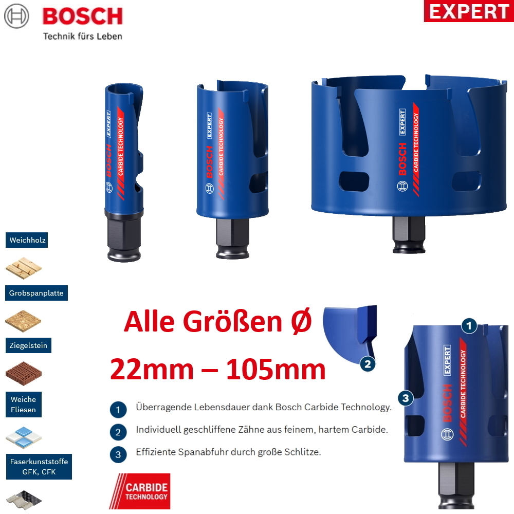 Produktinformationen "Bosch Lochsäge EXPERT Construction Material - 60mm Arbeitslänge - Ø 22 - 105 mm"