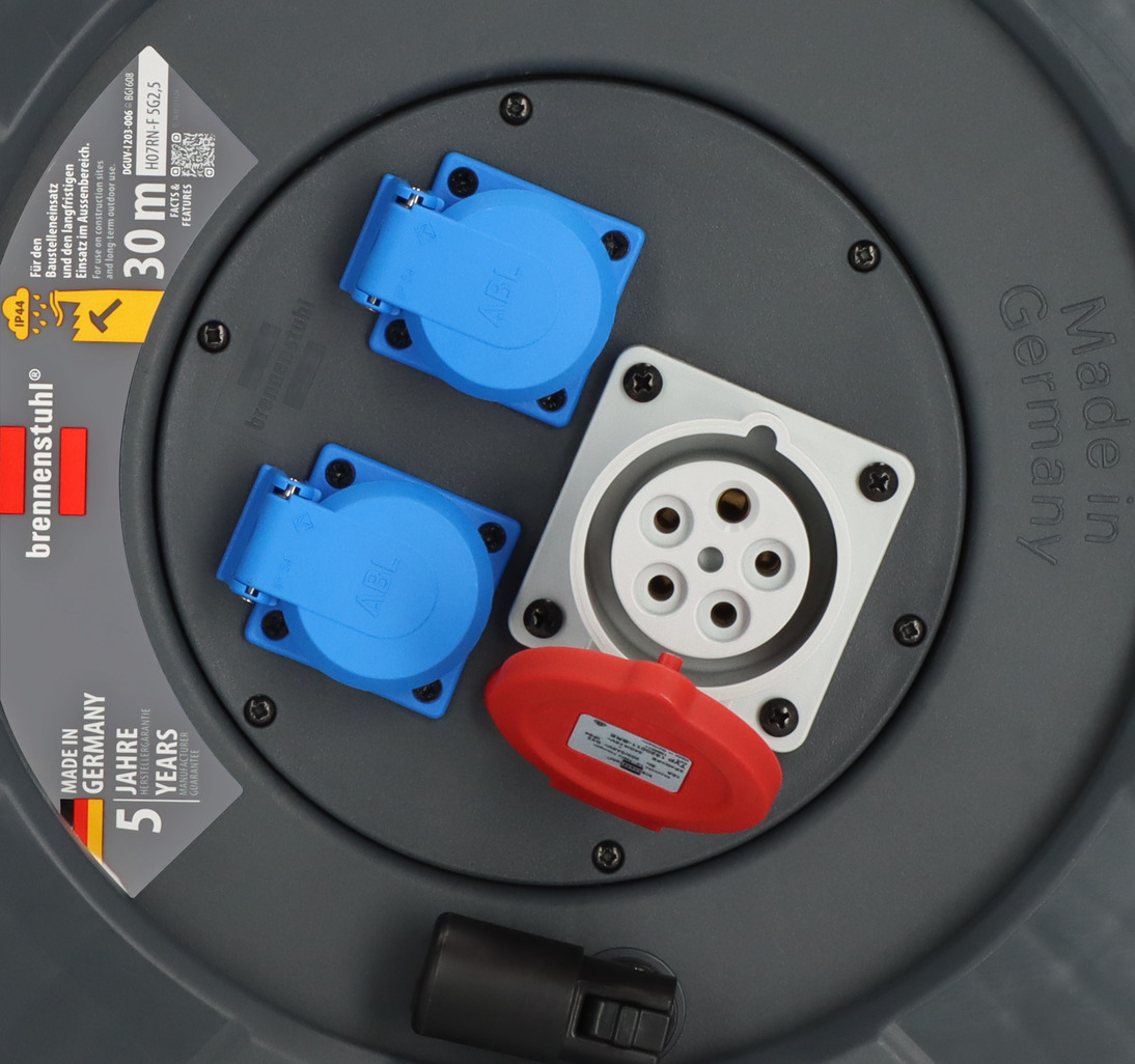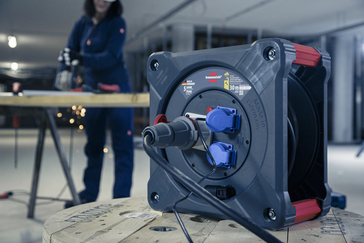 Die Professional CEE-Kabeltrommel mit einem CEE-Stecker (400V/16A), 1 CEE-Steckdose (400V/16A) und 2 spritzwassergeschützten Schutzkontakt-Steckdosen (230V) eignet sich dank robustem RN-Kabel und der Schutzart IP44 perfekt für die ständige Verwendung im Außenbereich, beispielsweise auf Baustellen. Die Kabeltrommel mit Rundum-Überrollschutz steht standfest auf allen vier Seiten und sorgt verfügt somit über eine perfekte Kabelführung auf allen vier Seiten. Die CEE-Kabeltrommel mit robusten Tragegriffe und Steckergarage auf allen vier Seiten überzeugt außerdem durch folgende Eigenschaften: