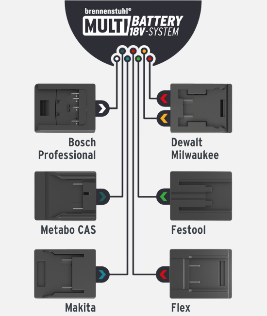 - Robuster Multi Battery LED Handstrahler mit abnehmbarer Akku-Schutzhaube inkl. 6 Schnittstellen-Adapter (alle inklusive) für genannte Powertool-Hersteller (Lieferung ohne Akku) - passenden Akku einstecken und loslegen