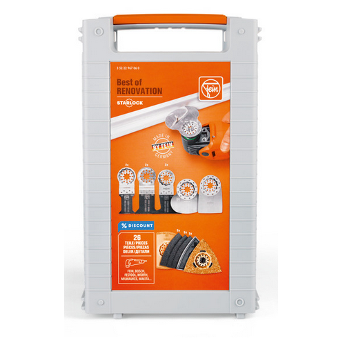 26-teiliges Zubehör-Set für alle anstehenden Renovierungsarbeiten. Passend für alle FEIN Multitools sowie alle anderen gängigen Multitools mit Starlock-Aufnahme. Im Set mit attraktivem Preisvorteil gegenüber Einzelbezug. Inhalt: 6 E-Cut Long-Life Sägeblätter (je 2 St. 50 x 35 mm, 50 x 50 mm, 50 x 65 mm), 1 Hartmetall-Raspel (80 mm), 1 Hartmetall-Segmentsägeblatt (Ø 75 mm, 2,2 mm), 1 fester Spachtel, 1 Schneidmesser (Pilzform), 1 Schleifplatte, ungelocht (80 mm), je 5 Schleifblätter (K 60, 80, 120).