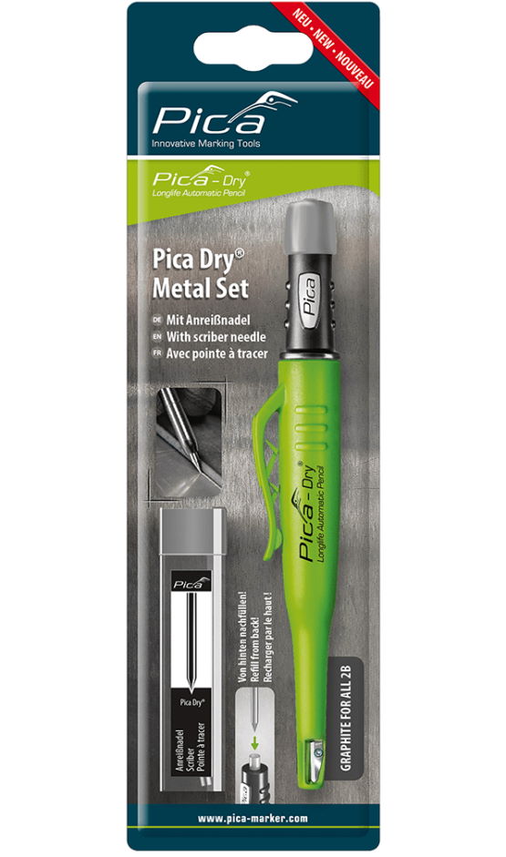 Das neue Bundle aus einem Pica Dry & einer Anreißnadel ist das ultimative Upgrade für jeden, der mit Metall arbeitet. Durch die aus Hartmetall bestehende Nadel können metallene Oberflächen präzise angerissen werden, ohne das diese verschleist.
