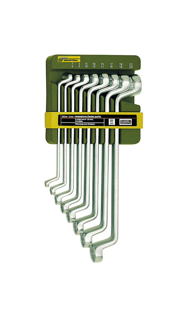 SlimLine-Doppelringschlüsselsatz, 8-teilig. Komplett mit Halter. Nach DIN 838 und ISO 3318.