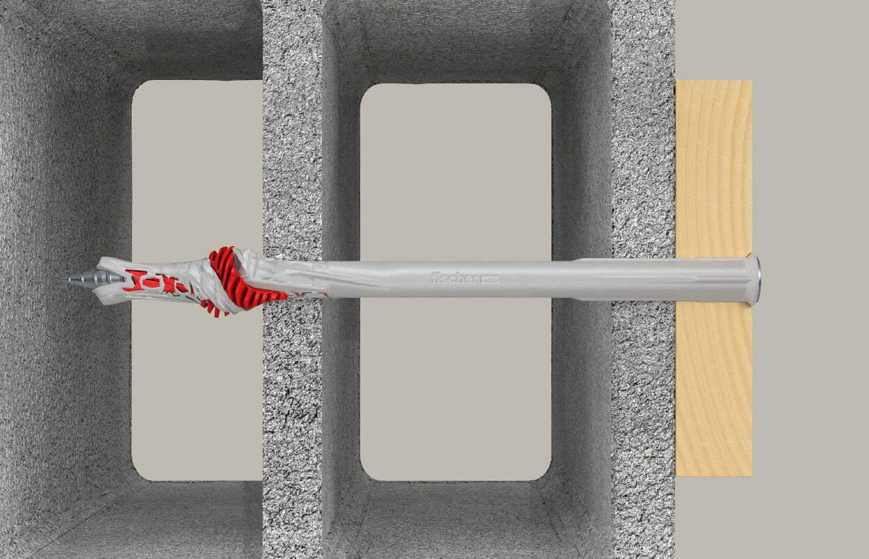 Der fischer Langschaftdübel DuoXpand mit zwei Verankerungstiefen ist mit der fischer Senkkopfschraube für Mehrfachbefestigungen von nichttragenden Systemen