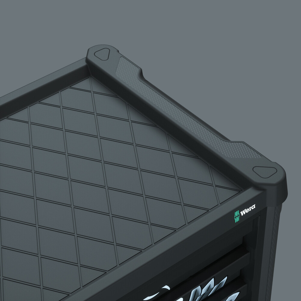 Dieser mobile Arbeitsplatz begeistert mit 7 Schubladen, darunter 5 flache und 2 hohe, bestückt mit erstklassigem Wera-Werkzeug.