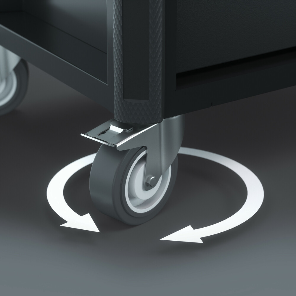 Das Hochleistungs-Fahrwerk mit 250 kg belastbaren Rädern und Doppelstopp an den Lenkrollen gewährleistet einfache Bewegung und sicheres Feststellen.