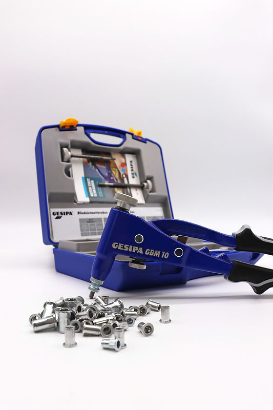 Praktisches Set mit dem GBM 10 Handgerät, passenden Blindnietmuttern und Gewindedornen.