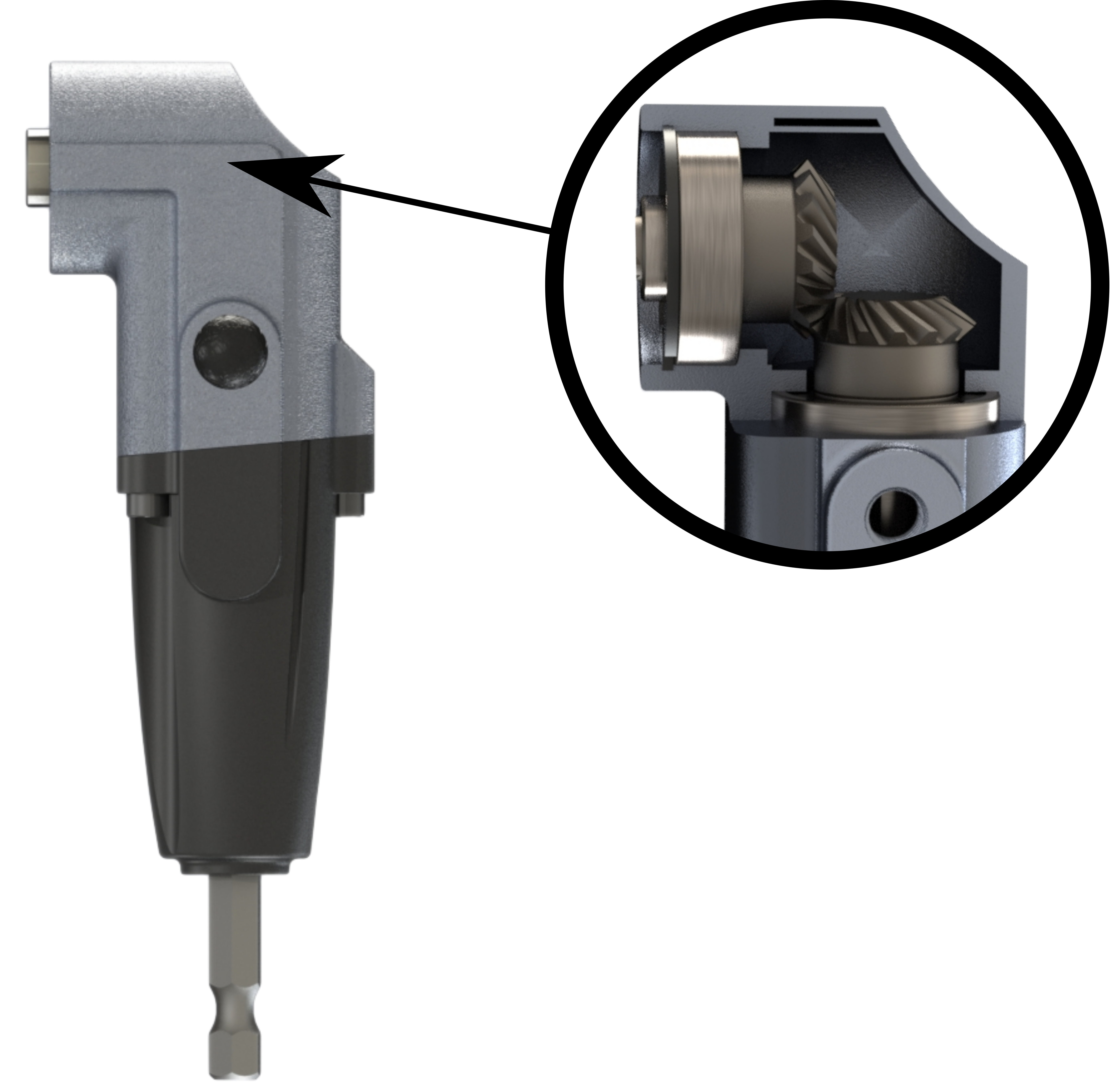 Stabile Winkelschraubvorrichtung mit Alugehäuse und schrägverzahnten Metallzahnrädern (ideale Kraftübertragung). Aufnahme für alle 1/4“ Bits und Bohrwerkzeuge (wie z.B. 1596) mit Bitfuß. Schraubwinkel 90°, mit Wechselgriff. Perfekter Halt des Bit-Schaftes durch eingebauten Magneten