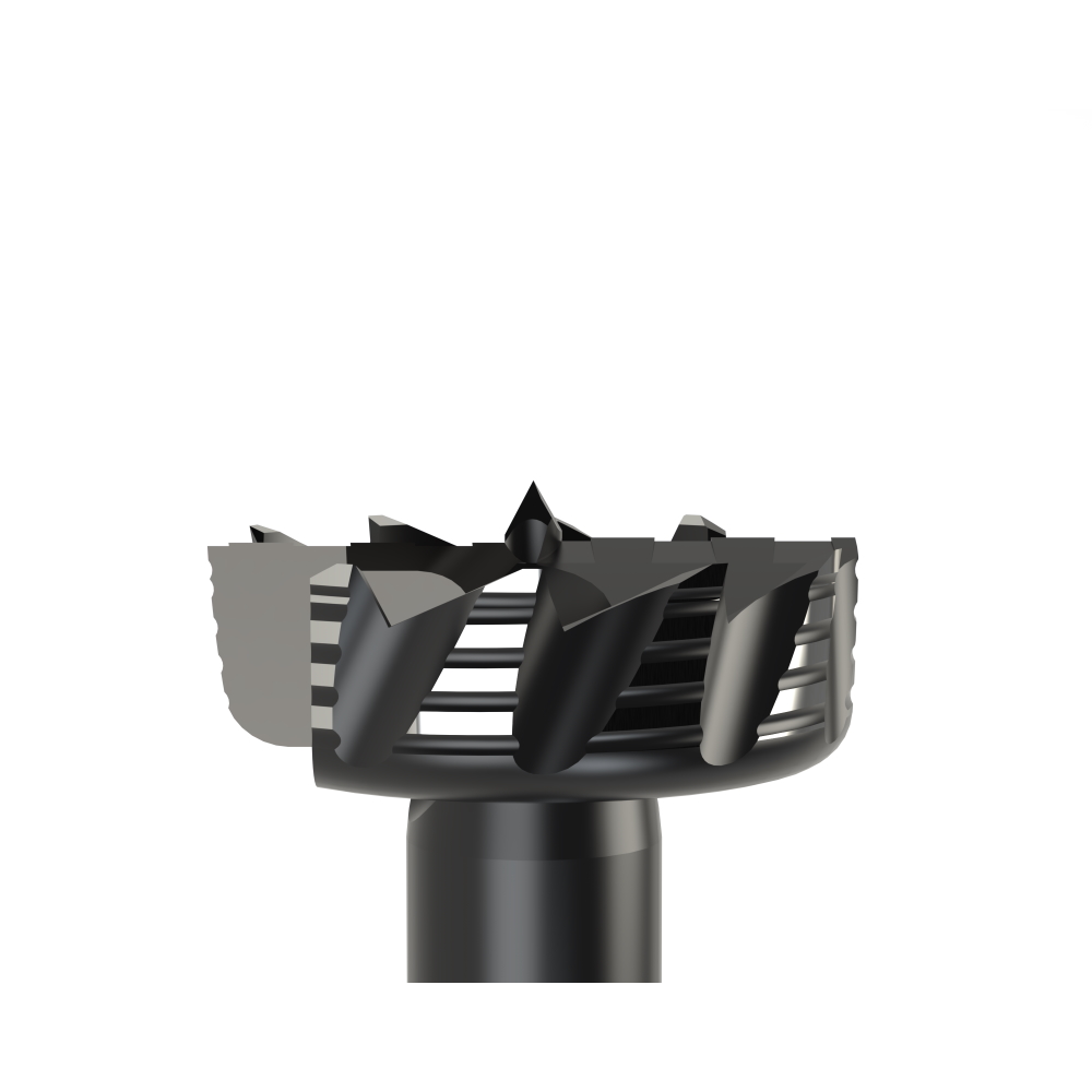- Effiziente Hauptschneiden: Zwei versetzt genutete Hauptschneiden (ab Ø 11 mm) und eine gezahnte, mit Längsrillen versehene Umfangsschneide reduzieren den Kraftaufwand und minimieren Reibung sowie Hitzeentwicklung.