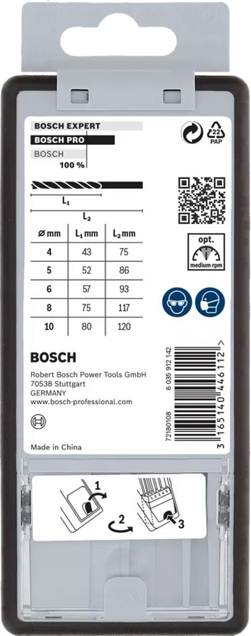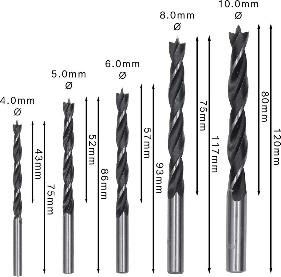 - 5 Holzspiralbohrer mit den Durchmessern: 4,0 mm, 5,0 mm, 6,0 mm, 8,0 mm, 10,0 mm